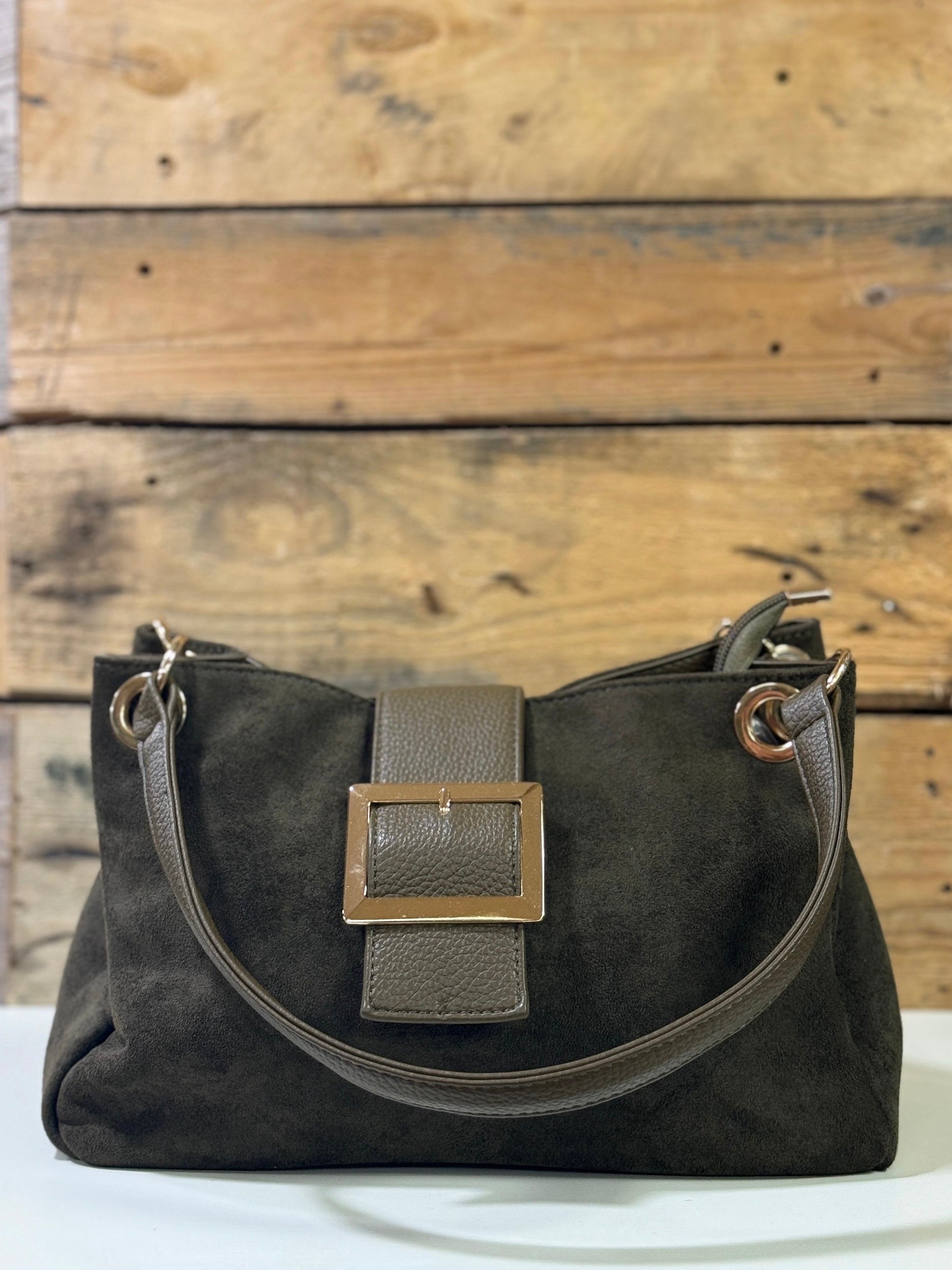 hannah k - 'Ciara' Khaki Faux Suede Buckle Bag