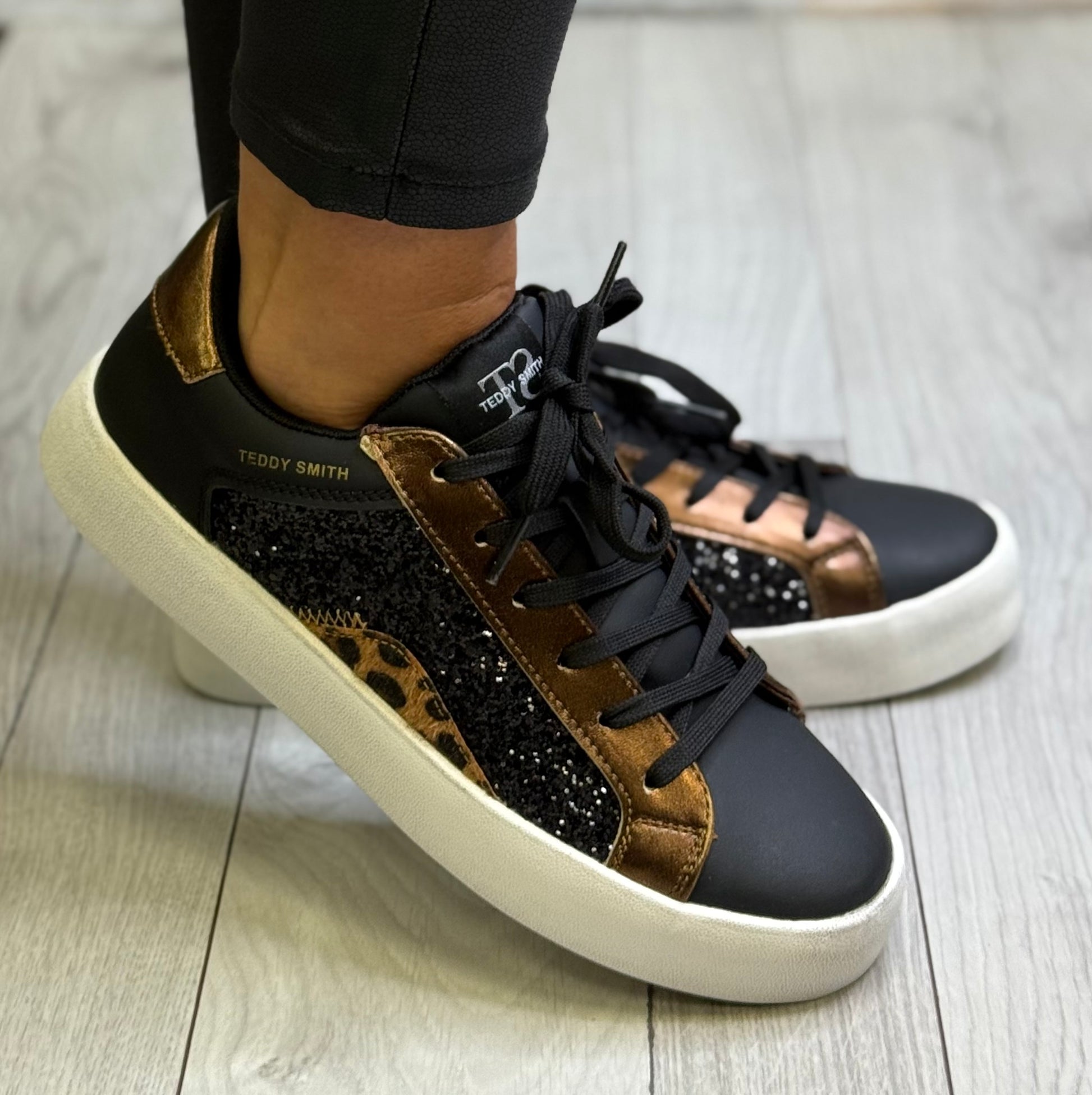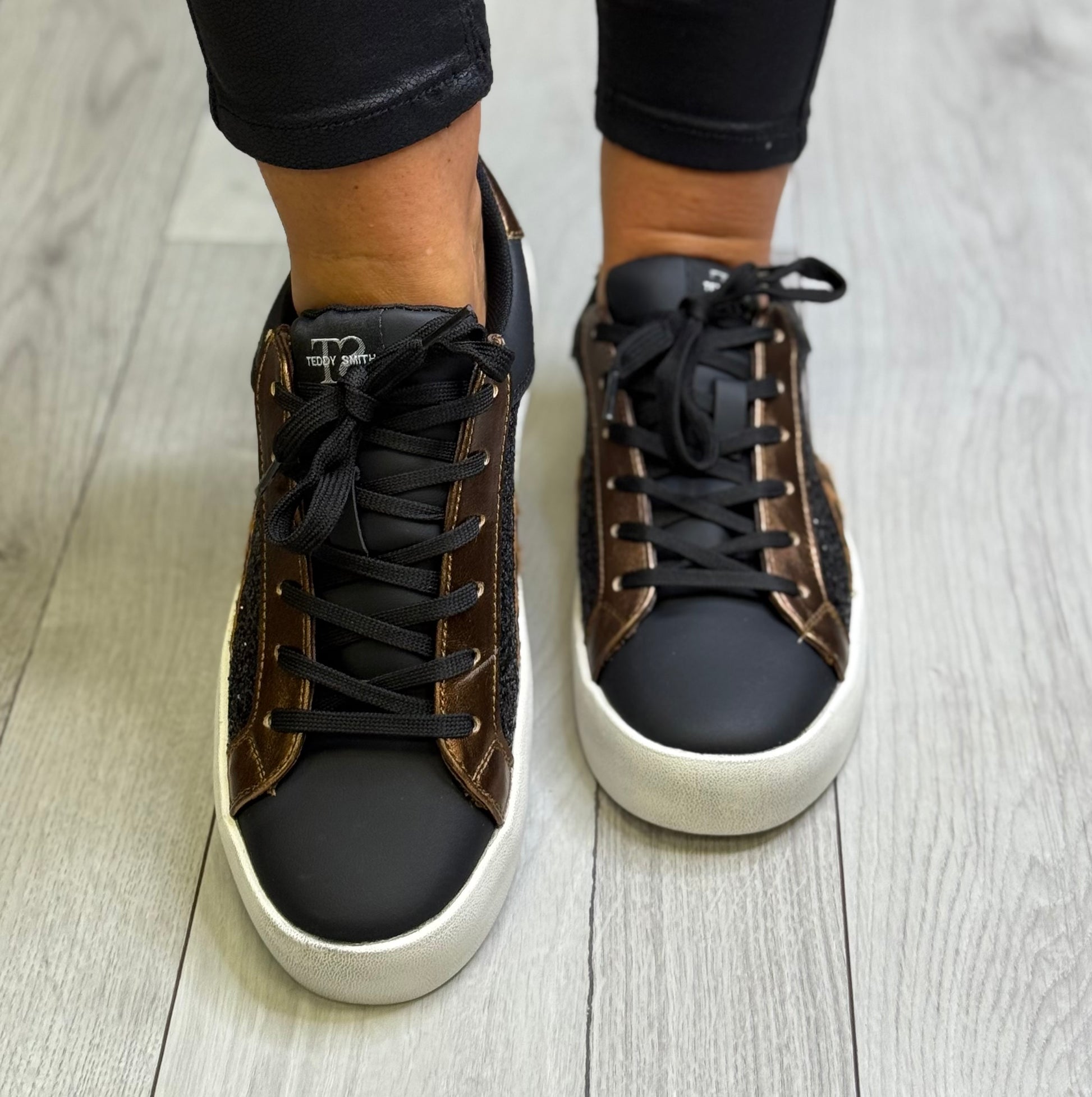 Teddy Smith - Black/Rose Gold Glitz Leather Trainer